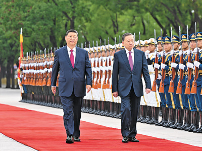 蘇林抵達(dá)時(shí),禮兵列隊(duì)致敬。習(xí)近平同蘇林登上檢閱臺(tái),軍樂(lè)團(tuán)奏中越兩國(guó)國(guó)歌,天安門廣場(chǎng)鳴放21響禮炮。蘇林在習(xí)近平陪同下檢閱中國(guó)人民解放軍儀仗隊(duì),并觀看分列式。
